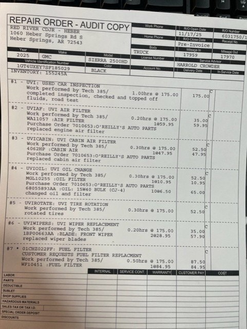 Introducing a powerful and luxurious 2025 GMC Sierra 2500HD Denali Ultimate 4WD — a heavy-duty truck that combines premium refinement with serious capability. This Denali Ultimate comes in Onyx Black with an Alpine Umber leather interior, offering a striking yet elegant look. Under the hood, it’s powered by a Duramax 6.6 L V8 turbodiesel paired with a 10-speed automatic transmission, delivering impressive towing power and torque.Inside, this Sierra doesn’t hold back: it boasts high-end comfort with memory leather seats, a tech-rich cabin with advanced connectivity features, and a fully loaded package that equips you for both work and weekend adventures. Whether you’re hauling heavy loads or cruising long distances, this 2500HD blends performance and luxury seamlessly.Recent Arrival!Red River Chrysler, Jeep, RAM and Dodge is your New Used Car Truck or SUV headquarters! Serving Heber Springs, Searcy, Batesville, Conway, Cabot and Mountain View, Arkansas! We will ship anywhere in the US! We offer competitive financing and have certified technicians to help with your maintenance needs. Call us @ 877-652-4076 or visit us at redriverdodge.com.